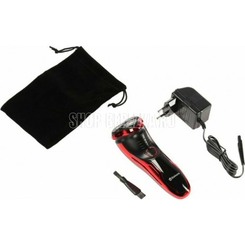 Бритва электрическая, работа от аккумулятора Ni-Cd (600 мА/ч), зарядка от сети 220-240В. Адаптер питания. 3 плавающие бритвенные головки. Влажное и сухое бритье. Бритвенные головки роторные. Щеточка д/очистки, мешочек д/хранения и переноски.
