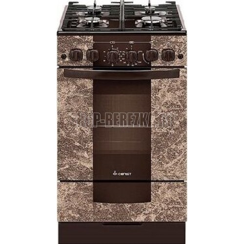 Габариты (ШхГхВ) 50х58,5х85 см. 4 газ. горелки. Электророзжиг горелок стола. Гриль горелка. Решетки горелок стола чугунные. Механический таймер. Полезный объём духовки: 52 л. Газ-контроль духовки. Вертел с электроприводом. Направляющие духовки: проволочные. Термоуказатель. Выдвижной ящик для посуды и принадлежностей. Без крышки. Фасад стеклянный с рисунком "мрамор" коричневый, варочная поверхность: стеклянная.
