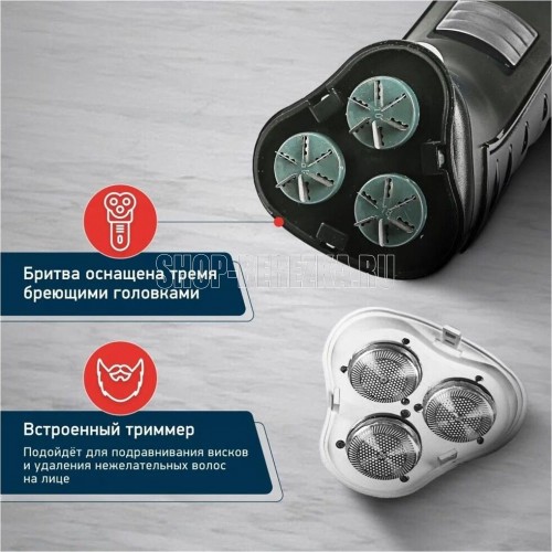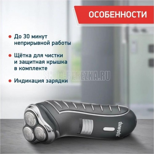 Мощность 3 Вт. Напряжение 1,2 В. Время работы на полностью заряженной аккумуляторной батарее 30 мин. Время зарядки 8 часов. 3 бреющие головки. Встроенный триммер для подравнивания висков. Электропитание от аккумуляторной батареи: Ni-Cd аккумулятор. Индикатор заряда батареи. Цвет: черный. Аксессуары: Щетка для чистки, Защитная крышка, Сетевой шнур.