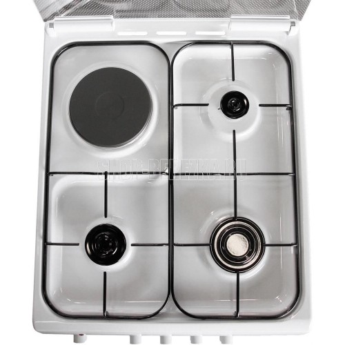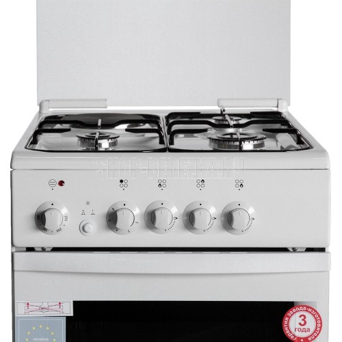 Габариты 850*500*600 Вес, кг - 38 Объём духовки 54 л. Основные характеристики варочной поверхности: 3 газовые конфорки 1,0/1,7/3,0 кВт 1 электрическая конфорка 1,5 кВт Основные характеристики духового шкафа: Электрическая духовка Нижний ТЭН - 1,2 кВт Верхний ТЭН - 0,8 кВт Терморегулятор Освещение Комплектация: Большой противень Малый противень Решётка для жарки Эмалированная решётка Стеклянная крышка рабочего стола Хозяйственный отсек Техническое описание: Цвет - белый