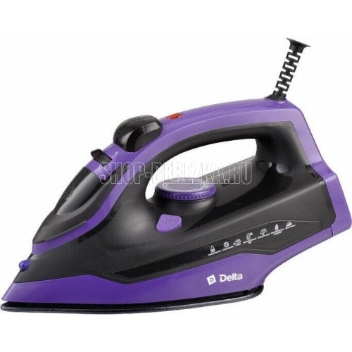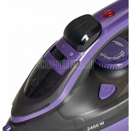 Номинальная потребляемая мощность 2400 Вт, Объем резервуара для воды 350 мл, Регулируемая подача пара 28 г/мин, Паровой удар 135 г/мин, Керамическое покрытие подошвы, Увеличенный резервуар для воды, Индикатор нагрева утюга, Терморегулятор, Три рабочих режима: сухое глажение, отпаривание, разбрызгивание воды, Возможность регулировки степени отпаривания, Функция «Паровой удар», Функция «Антинакипь», Защита от перегрева, Цвет: черный с фиолетовым.