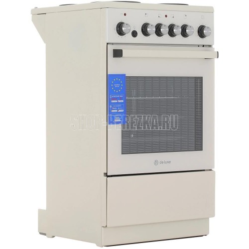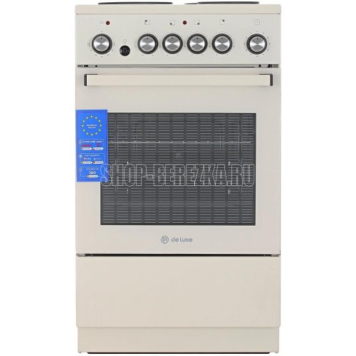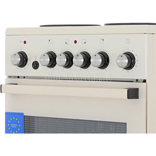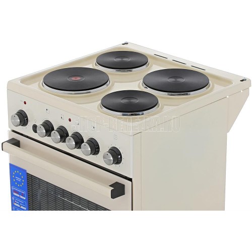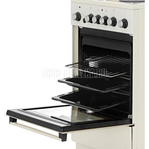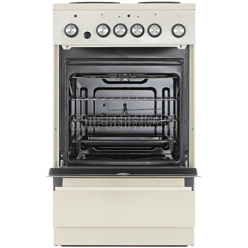 Размеры, мм - высота/ширина/глубина – 850/500/500 * Цвет - бежевый * 4 электрические конфорки 1,0/1,5/1,5/2,0 кВт * Объём духовки 43 л. * Гриль * Вертел * Освещение * Таймер механический * Большой противень * Малый противень * Решётка для жарки * Хозяйственный отсек *