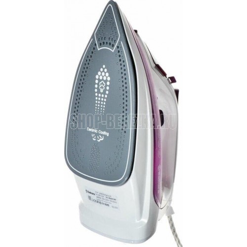 Мощность 2400Вт, резервуар для воды 290мл, керамическая подошва (213х118 мм), сухое глажение / глажение с пароувлажнением, регулировка подачи пара, вертикальный пар, самоочистка, световой индикатор работы, кабель питания 1,8 м.