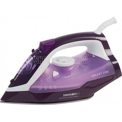 GALAXY LINE GL 6124 Мощность, Вт: 2500 Керамическое покрытие подошвы Уплотнитель крышки резервуара Функция «Самоочистка» Функция "Антикапля" Функция "Антинакипь" Указатель максимального уровня воды Индикатор нагрева Вертикальное отпаривание Паровой удар Функция увлажнения Защита от перегрева Емкость для воды 370 мл. Постоянная подача пара до 50 г/мин Паровой удар до 230 г/мин Мерный стакан Напряжение сети, В: 220-240 Частота, Гц: 50