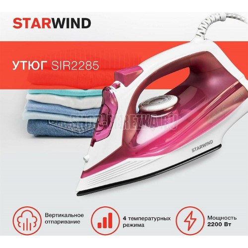 Мощность: 2200 Ватт Емкость для воды 320 мл Регулировка температуры Функция разбрызгивания Паровой удар Вертикальное отпаривание Функция самоочистки от накипи Противокапельная система Керамическое покрытие подошвы Шарнирное вращение шнура на 360 °С Длина сетевого шнура 1,8 м