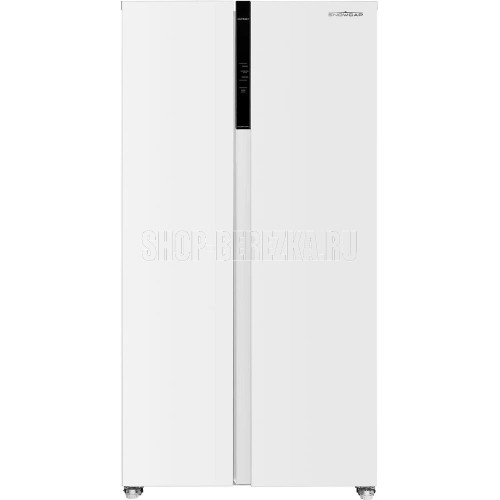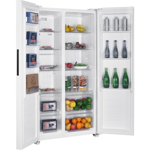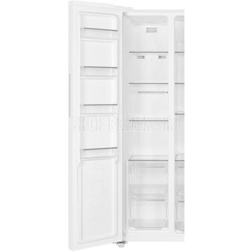 Двухдверный холодильник серии SIDE BY SIDE, морозильная камера сбоку. Total No Frost, полезный объем 436 (291/145) литров, А++ класс, инверторный компрессор, 39 дБ, R600а, SN-T, сенсорный дисплей, светодиодная подсветка, потребление энергии 373 кВт/год, мощность замораживания 10 кг/сутки, звуковая сигнализация открытой двери, интегрированные ручки. Холодильное отделение: 4 полки из стекла, 3 боковых полки, 2 ящика для овощей и фруктов. Морозильное отделение: 4 полки из стекла, 3 боковых полки, 2 выдвижных ящика. Режимы: отпуск, супер-заморозка, эко, цвет Белый, ВхШхГ: 1770×905×595 мм. Регулируемые ножки и петли дверей.