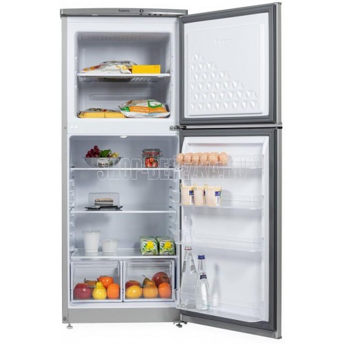 Двухкамерный холодильник с нижней морозильной камерой; Габариты 145x58x62см; Объем: 230/160/70л; Расположение морозильной камеры: верхнее; Класс энергоэффективности: A; Оттаивание холодильной камеры: автоматическое; Материал полок: стекло/пластик; Количество ящиков в холодильном отделении: 2; Количество полок в холодильном отделении: 2; Минимальная температура в морозильной камере: +18 °C; Суточный расход электроэнергии, при температуре окружающего воздуха 24°C: 82 кВтч; Температура в отделении для хранения свежих пищевых продуктов: от 0 до 8 °C; Размораживание морозильной камеры: ручное; Цвет: металлик; LED освещение; Механическое управление; Климатический класс: N; Максимальный уровень шума: 42 дБ; Количество компрессоров: 1; Возможность перевешивания двери