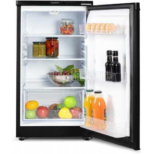 Узкий однокамерный холодильник без морозильного отделения; Габариты (ВхШхГ): 87x48x60,5см; Цвет: Черный; Управление Механическое; Освещение: LED; Общий объем, л: 115; Объем холодильной камеры, л: 115; Количество камер: 1; Количество компрессоров: 1; Суточный расход электроэнергии, при температуре окружающего воздуха 24°C, кВтч: 0.47; Климатический класс: N; Возможность перевешивания двери; Класс энергоэффективности: A; Максимальный уровень шума, дБ: 40