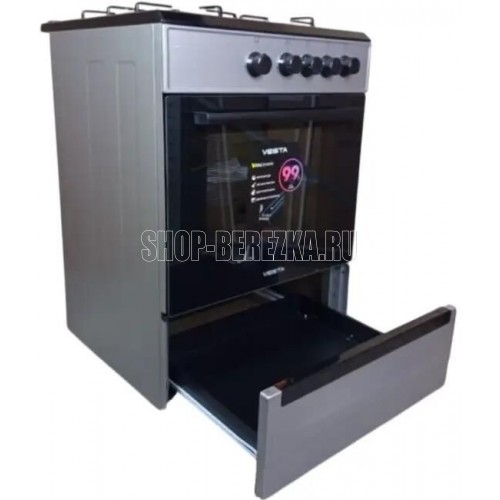 Горелки стола: Газовые – 4 шт. Ящик для посуды - выдвижной. Мощность горелок рабочего стола: -Горелка передняя левая/правая – 2,0/2,4 кВт. -Горелка задняя левая/правая – 2,0/1,0 кВт. -Мощность горелки духовки – 2,5 кВт. Объем духовки в литрах: 65 л. Нижний/верхний нагреватель духовки – газ. Газ-контроль духовки. Решетка рабочего стола – сталь. Щиток. Элементы комфортности: Термометр духовки. Противень – 1 шт. Масса нетто/брутто – 36/40 кг.