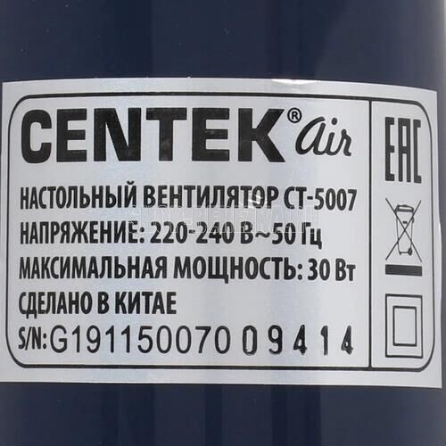 CENTEK CT-5007 (синий) Напряжение питания 220-240 В~50 Гц Мощность 30 Вт Кол-во режимов работы 3 Диаметр решетки 31 см ОПИСАНИЕ ПРИБОРА Использование В настольном варианте Регулируемый наклон 0-30° Регулируемый поворот 90° Безопасная лучевая решетка КОМПЛЕКТНОСТЬ 1. Передняя решетка 2. Задняя решетка 3. Кольцо для фиксации передней и задней решеток вентилятора 4. Лопасти вентилятора 5. Основной корпус вентилятора