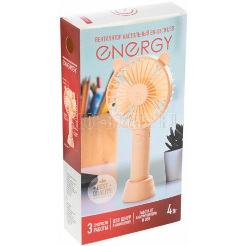 ENERGY EN-0610 USB (настольный, аккумулятор) розовый Габариты (см): 15.2x10x15 USB вентилятор Размеры: 14,5*9,8*14,5 см Регулировка наклона 360° 1 скорость Длина шнура 1,1 м Мощность 2.5 Вт Диаметр лопости 10 см
