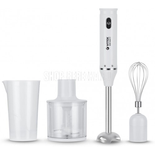Блендер погружной. Мощность: 800 вт, Количество скоростей: 1, Управление: механическое, Материал корпуса: пластик, Материал погружной части: нержавеющая сталь, Емкость измельчителя: 450 мл, Емкость мерного стакана: 700 мл, Венчик для взбивания, Мерный стакан, Длина сетевого шнура: 110см, Измельчитель, Цвет: Белый