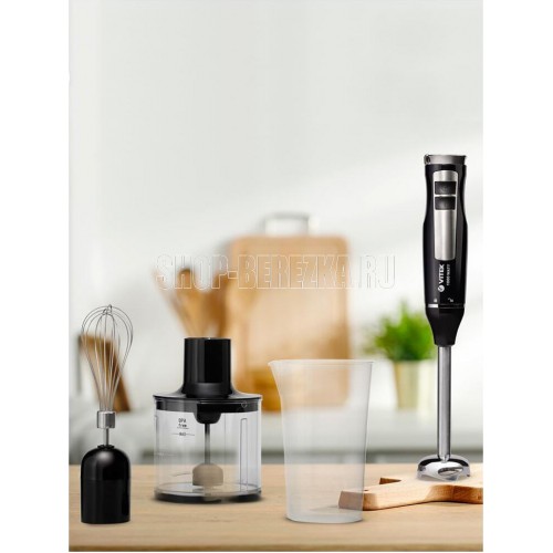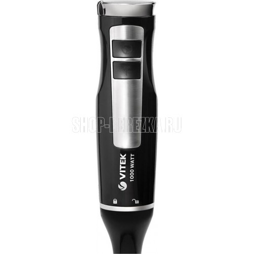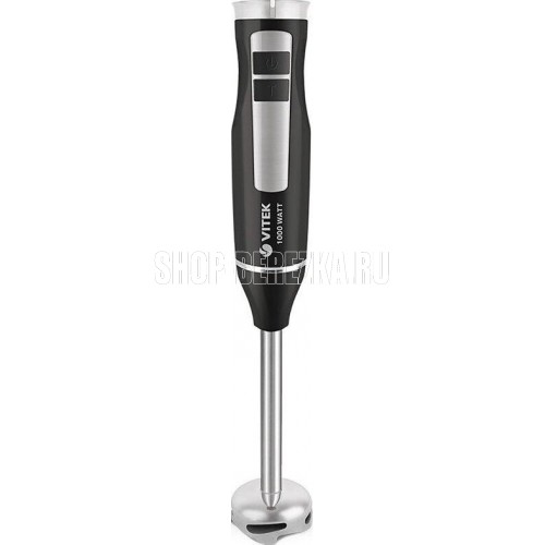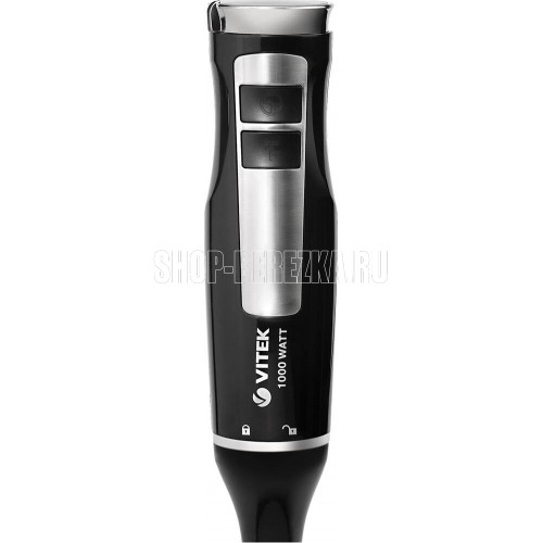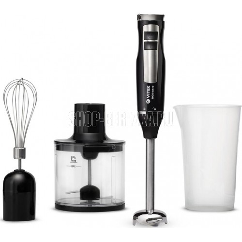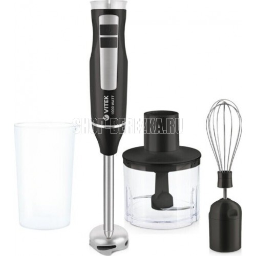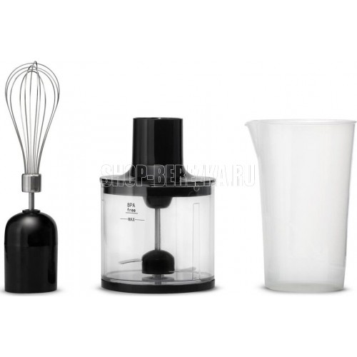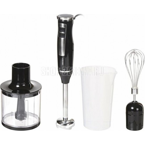 Блендер погружной. Мощность: 1000 вт, Турборежим, Плавная регулировка скорости, Управление: механическое, Материал корпуса: пластик, Материал погружной части: нержавеющая сталь, Емкость измельчителя: 450 мл, Емкость мерного стакана: 700 мл, Венчик для взбивания, Длина сетевого шнура: 110см, Цвет: Черный/серебро