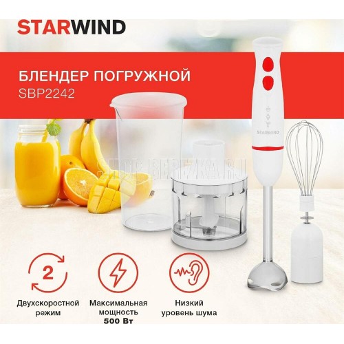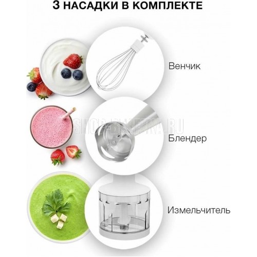 Блендер погружной. Мощность 500 Вт, Количество скоростей/режимов 2, Материал погружной части нержавеющая сталь, Материал ножей нержавеющая сталь, Насадки в комплекте, Измельчитель, Венчик для взбивания, Мерный стакан, Электропитание от сети, Материал корпуса пластик, Цвет белый/оранжевый, Гарантия 12 мес.