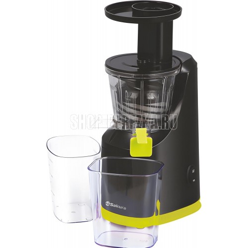 Соковыжималка шнековая, макс.мощность 200 Вт, ном.мощность 150 Вт, макс.скорость вращения: 60об./мин., резервуар для сока 800 мл, резервуар для жмыха 600 мл, механ.управление, корпус пластик, функция "реверс", горловина 44*28 мм, пластик.толкатель, защи