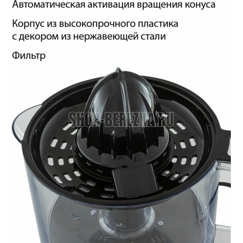 Соковыжималка для цитрусовых, Объем 0,8 л., Мощность 30 Вт., 2 сменные насадки-конуса для фруктов разного размера, Прозрачная крышка для защиты от пыли, Прорезиненные ножки, Пластиковый корпус с декором из нержавеющей стали, Легко разбирать и мыть