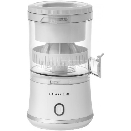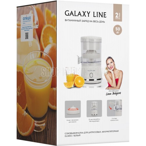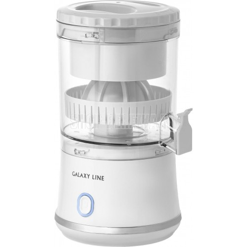Соковыжималка аккумуляторная Galaxy LINE GL 0855, белый, для цитрусовых, 50 Вт, 250 мл, система "капля-стоп", индикатор заряда, конус с фильтром для мякоти, аккумулятор Li-ion емкостью 1500 ма*ч, напряжение батареи 3,7 В, 35 циклов работы без подзарядки, зарядка в течение 2 часов
