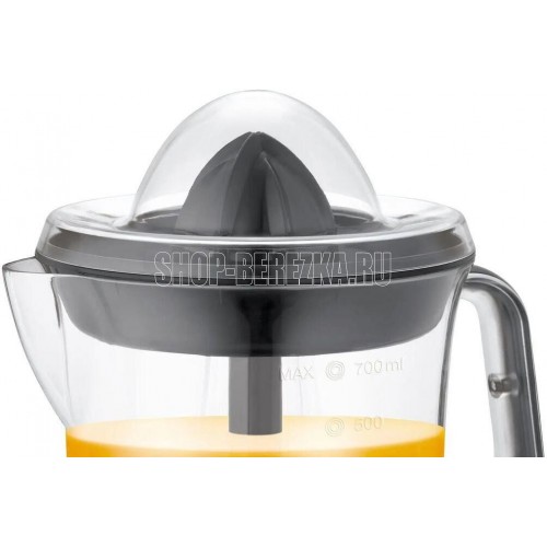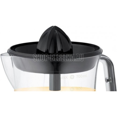 Цитрусовая соковыжималка. Мощность: 25 Вт, Количество скоростей: 2, Материал корпуса: пластик, Материал сетки: нержавеющая сталь, Прорезиненные ножки, Длина сетевого шнура: 100 см, Цвет: Черный/серебро