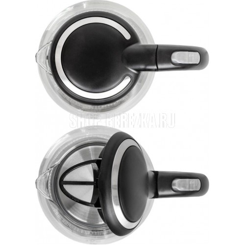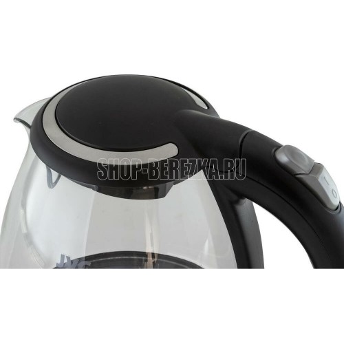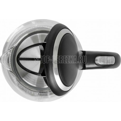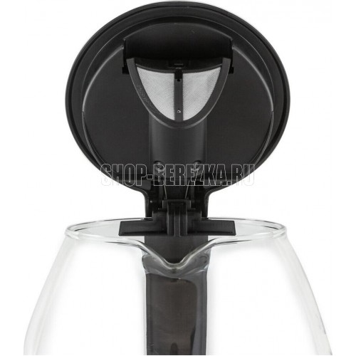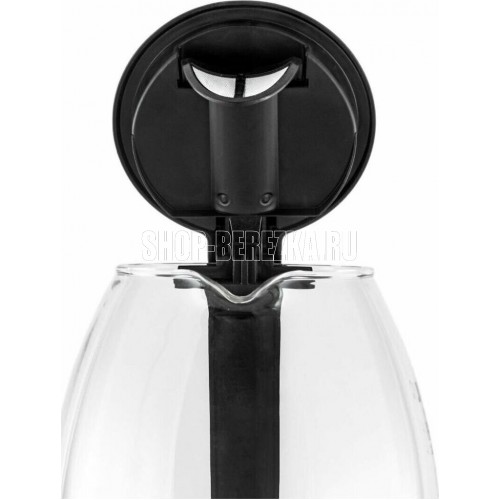 Чайник электрический, объем 1,7л, максимальная мощность 2200 Вт, светодиодная подсветка, автоматическое открывание крышки, фильтр от накипи, защита от включения без воды, автоматическое отключение, индикация включения, индикатор уровня воды, подставка с возможностью вращения на 360 градусов, хранение электрошнура в подставке, материал корпуса: боросиликатное стекло