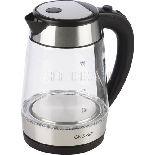 ENERGY E-254 (1.7л) стекло, пластик цвет черный Объем 1,7л Мощность 220-240V,50/60Hz, 1850-2200W Корпус из термостойкого стекла Голубая LED подсветка Закрытый нагревающий элемент из нержавеющей стали Поворот на подставке 360° Защита от работы без воды Автоотключение Кнопка для открытия крышки