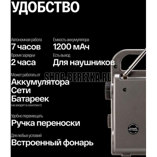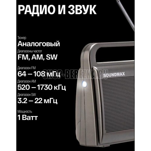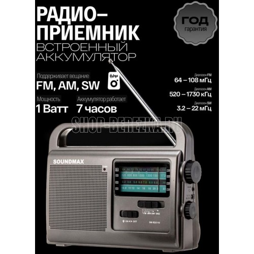 Тюнер; Аналоговый; Диапазоны частот; FM, AM, SW; FM диапазон, МГц; 64 - 108; AM диапазон, кГц; 520 – 1730; SW диапазон, МГц; 3.2 – 22; Конструкция антенны; Телескопическая поворотная; Автопоиск радиостанций; Нет; Звук; Выходная мощность (RMS), Вт; 1; Количество динамиков; 1; Акустический тип; Моно; Входные и выходные разъёмы; Аудиовход; Нет; Выход на наушники; Да; Разъём USB; Нет; Слот для карты памяти (microSD); Нет