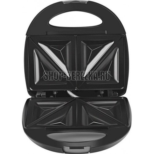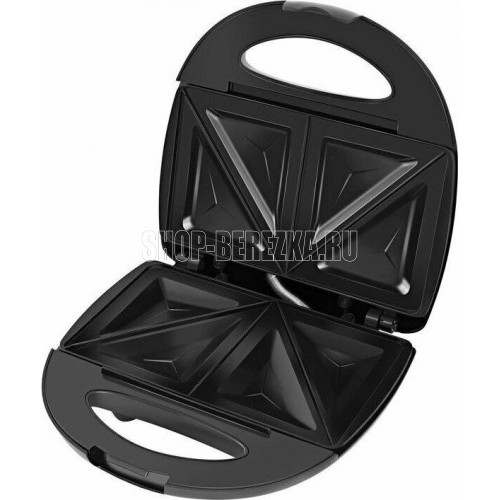 Мощность 750 Вт. Материал корпуса - термостойкий пластик, декорированный хромир. сталью. Антипригар. покрытие сэндвичных форм. Сэндвичные формы на 4 ломтика, с выступающими бортиками, препятствующими вытеканию начинки. Двухпозиционный фиксатор крышки.