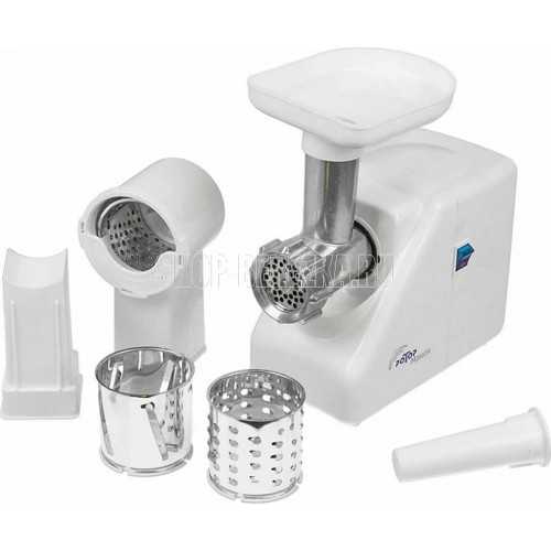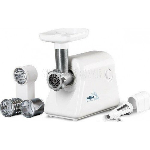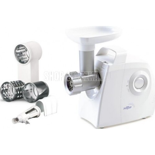 Мощность 1500Вт. Тип мясорубки шнековый. Производ-ть при пригот-и фарша не менее 35 кг/ч. Габариты: 258х135х207 мм. Комплектация: мясорубка + соковыжималка, большая овощерезка.