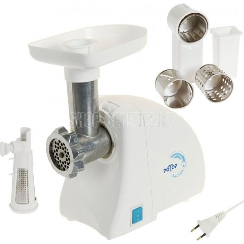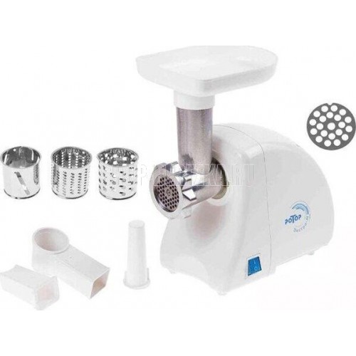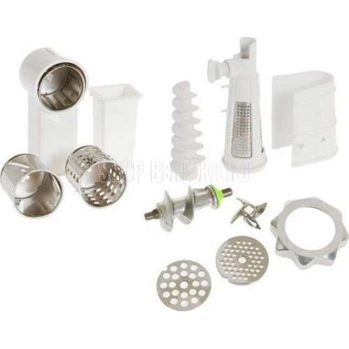 Мощность 1500Вт. Тип мясорубки шнековый. Производ-ть при пригот-и фарша не менее 35 кг/ч. Габариты: 234х150х210 мм. Комплектация: кухонный комбайн - мясорубка + насадки: соковыжималка, малая овощерезка