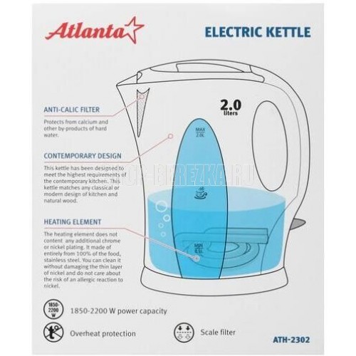 Мощность 2000 Вт. Объем 2,0 литра. Современный дизайн. Быстрое закипание. Фильтр от накипи. ТЭН из нержавеющей стали. Автоматическое отключение. Защита от перегрева без воды. Электрошнур в цокольной подставке.