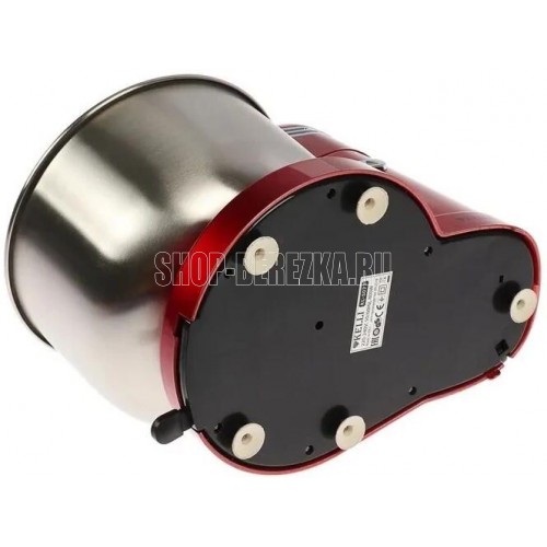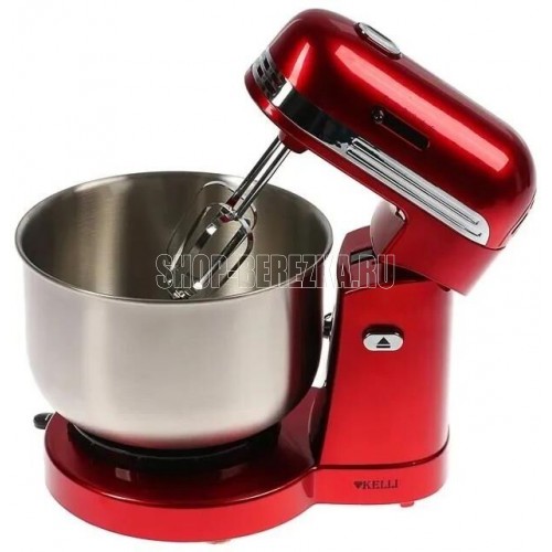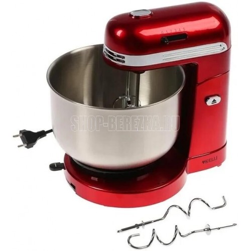 Мощность 500 Вт. Цвет красный. 5 скоростных режимов. Съемные насадки. Насадка для замешивания теста. Венчики для взбивания. Съемная металлическая чаша: 3,5 л. Рычаг для смещения чаши. Кнопка для наклона блока.