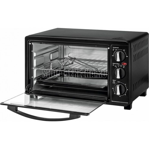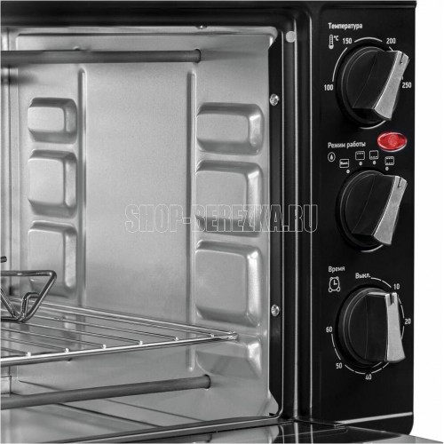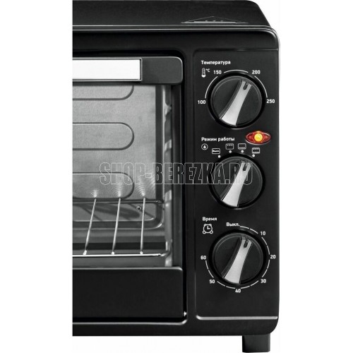 Объем 23 л, механическое упр., 1500 Вт, таймер 60 минут со звуковым сигналом, регулировка температуры 100-250 С, функции: гриль, жарка, запекание, эмалированный противень, решетка и ручка для противня в комплекте