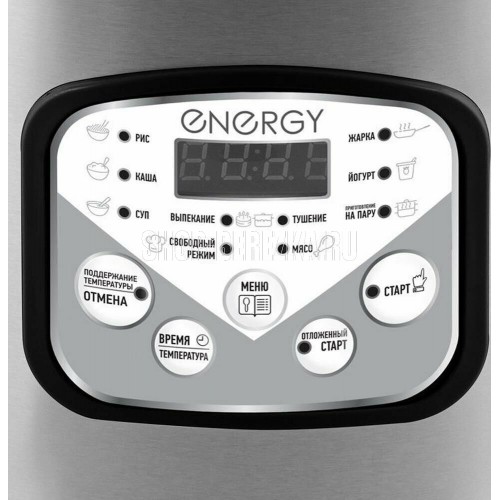 ENERGY EN-257 900Вт Объем 5л - Чаша с антипригарным покрытием - Отложенный старт - Поддержание температуры - Автоматическое отключение системы при перегреве - LЕD - дисплей - в комплекте: мерный стаканчик, ложка, контейнер-пароварка - 10 программ приготовления: Рис Плов Каша Суп Жарка Выпекание Приготовление на пару Тушение Йогурт Подогрев