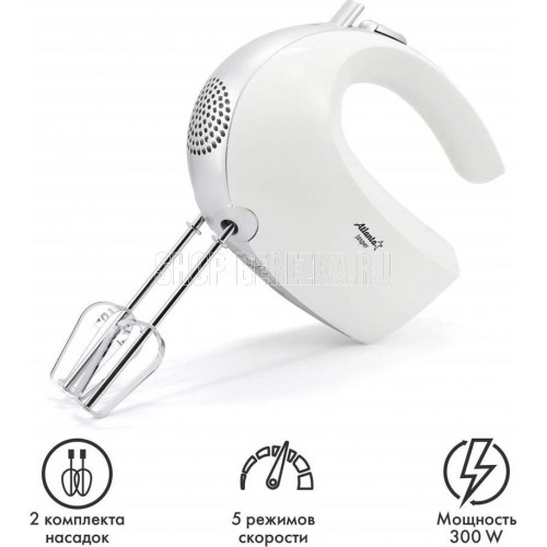 Номинальная мощность 300 Вт. Режим «Турбо». Два комплекта хромированных насадок. Кнопка легкого извлечения насадок. Пять скоростей. 230 B ~ 50 Гц