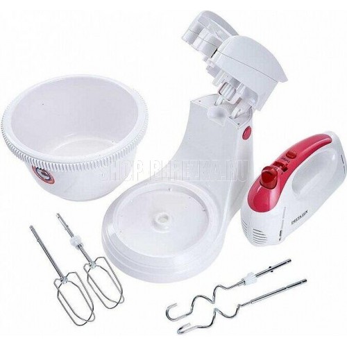 Номинальная потребляемая мощность 350 Вт, Объем чаши 2,5 л, Автоматически вращающаяся съемная чаша, Механизм откидывания миксера, Кнопка извлечения насадок, Резиновые противоскользящие ножки, 2 режима работы: ручной и стационарный, 5 скоростных режимов, Режим «ТУРБО».