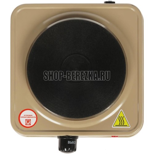 Номинальная потребляемая мощность 1000 Вт, Количество конфорок 1 штука, Вид конфорок диск, Эмалированная рабочая поверхность, Цвет эмали: бежевый, Поворотный механический переключатель, Световой индикатор работы, Терморегулятор, Упаковка: цветная коробка.