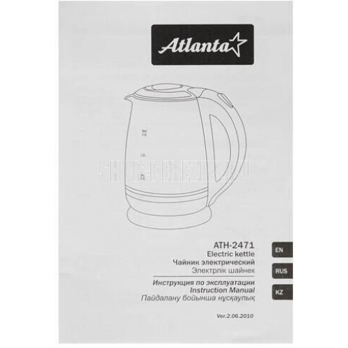 ATLANTA ATH-2471 (WHITE) Чайник стеклянный электрический Объем 2.0 литра Корпус из термостойкого стекла Иллюминация Специальная ручка от скольжения Поворот на подставке на 360° Быстрое закипание Фильтр от накипи Закрытый нагревательный элемент Автоматическое отключение Защита от перегрева без воды Электрошнур в цокольной подставке. 67см Номинальная мощность 1850-2200 Вт 220-240 B ~ 50/60 Гц