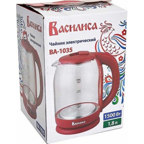 ВАСИЛИСА ВА-1035 стекло бордовый Параметры Объем 1,8 л Номинальная потребляемая мощность 1500 Вт Описание Корпус из высококачественного термостойкого стекла Закрытый нагревательный элемент из нержавеющей стали Вращение корпуса на 360° Цвет: бордовый Шкала уровня воды Внутренняя LED-подсветка Отсек для хранения электрошнура Автоматическое отключение при закипании Блокировка включения без воды Упаковка: цветная коробка