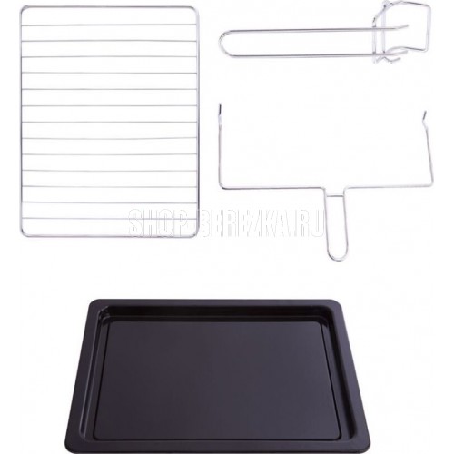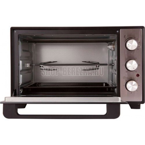 Печь электрическая, объем камеры печи 30 литро, механическое управление, двойное жаропрочное стекло, потребляемая мощность 1600 Вт, температура нагрева печи: 100-250°С, функция электрического гриля, электромеханический вертел, 6 режимов нагрева, таймер до 60 минут, индикация включения, сигнал окончания приготовления, внутренняя подсветка, металлическая решетка, плоский противень, вертел, держатель для вертела, ухват