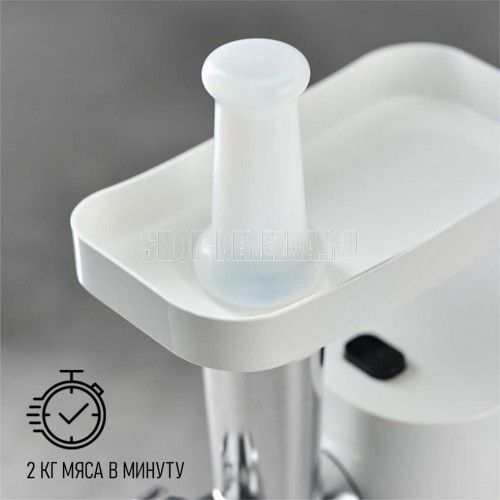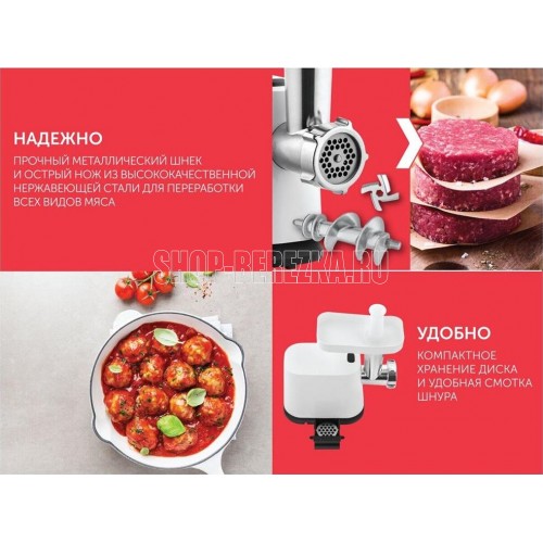 Тип: Без овощерезок. Мощность, Вт: 1800. Производительность кг/мин: 2. Функция реверс: Да. Перфорированные диски для мяса, размер отверстий мм: 5 и 7. Защита двигателя от перегрузки: Да. Металлическое соединение шнека: Да. Нож из нержавеющей стали: Да. Насадка кеббе: Да. Насадка для приготовления домашних сосисок: Да. Материал лотка для подачи мяса: Пластик. Резиновые ножки для повышенной устойчивости: Да. Количество решеток: 2. Длина электрошнура, м: 1. Особенности модели: Компактный размер.