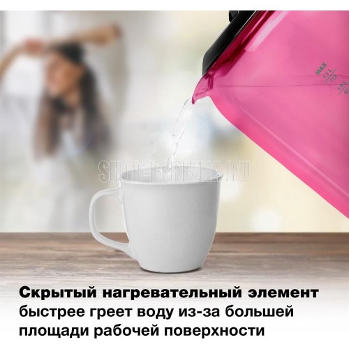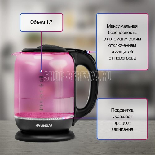 Общие характеристики Максимальный объем1.8 л Мощность2200 Вт Нагревательный элементскрытый Корпус Цветмалиновый Материал корпусастекло Дополнительный цветчерный Особенности Индикатор включенияДА Индикатор уровня водыДА Автоматическое отключениеДА Температурные режимы1 шт Кнопка открытия крышкиДА Защита от включения без водыДА Подсветка водыДА Подставка 360 градусовДА Срок гарантии24 мес.