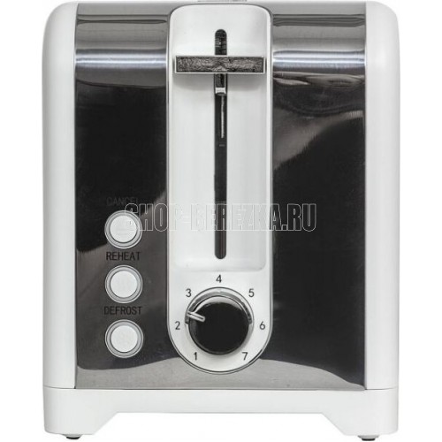 Тостер на 2 ломтика, мощность 900 Вт, 7 степеней поджаривания тостов, функция подогрева, функция размораживания, функция автоматического отключения, кнопка «Отмена», решетка для подогрева булочек, поддон для сбора крошек, термоизолированный пластиковый корпус, нескользящие резиновые ножки, отсек для компактного хранения шнура