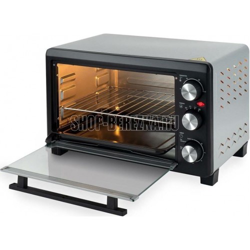 1500 Вт, объем камеры 23 л, серебристый корпус и часть фронтальной поверхности, панель управления черного цвета, декоративные элементы из нержавеющей стали и хрома, таймер на 120 мин + функция "работа без таймера", температура нагрева до 250 C, 3 режима работы (верхний нагрев, нижний нагрев, одновременный верхний и нижний нагрев), Напряжение питания 230 В; Частота 50 Гц, световой индикатор, Механический тип управления, ножки с нескользящей опорой, внутренняя подсветка, современный дизайн, Аксессуары: эмалированный прямоугольный противень, решетка гриль, ухват для снятия противня, поддон для сбора крошек и масла, Размеры без упаковки (см): 46,7x35x29 и Вес нетто без упаковки (кг): 5,8