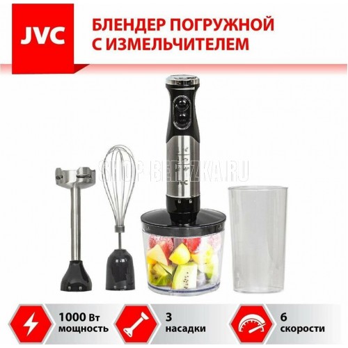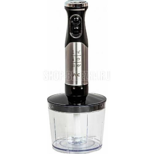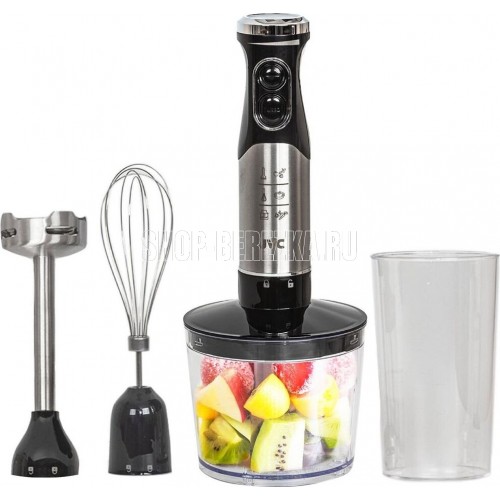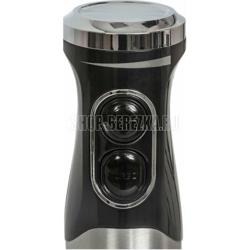 Блендер погружной, набор, максимальная мощность 1000 ватт, 2 скорости включая режим ТУРБО, бесступенчая регулировка скорости - до 6 скоростых режимов, погружная часть блендера из нержавеющей стали, измельчитель 500 мл, мерный стакан 700 мл, венчик для взбивания, цвет корпуса черный с металлической вставкой
