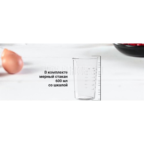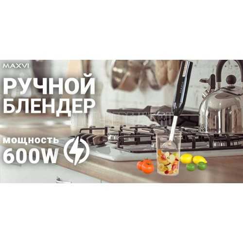 Мощность 600 Вт, 2 режима скорости, погружная часть и лезвия ножа из нержавеющей стали, 2 в 1 (блендер и миксер + мерная чаша).