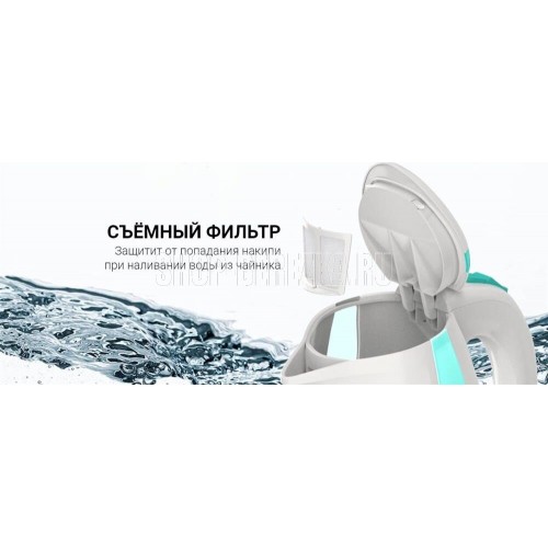 Мощность 2200 Вт, 1.7 литра, пластиковый корпус, LED-подсветка, кнопка открытия крышки, подставка с вращением 360 градусов, шкала уровня воды, автоотключение, съёмный фильтр от накипи, скрытый нагревательный элемент.