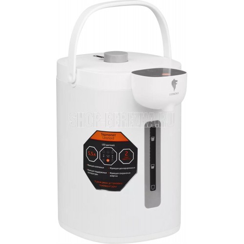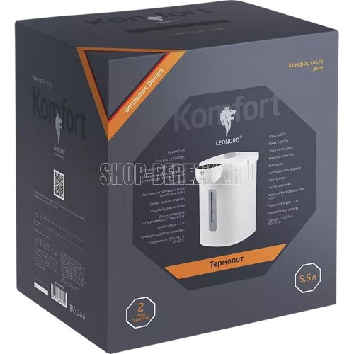 Мощность 1600 Вт Объем 5,5 л Сенсорная панель управления Автоматическое поддержание температуры после кипячения LED дисплей Автоматическая подача воды нажатием кнопки Замок защита от детей Видимый уровень воды Внутренняя колба из нержавеющей стали 304 Ручка для удобства переноск Функция кипячение Функция дехлорирование Функция поддержания температуры 9 режимов установки температуры 40С, 45С, 50С, 60С, 70С, 80С, 90С, 95С, 100С Длина шнура 1,2 м