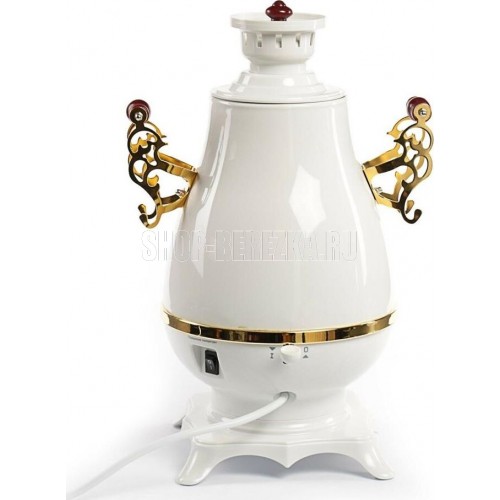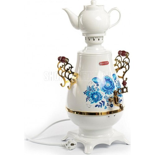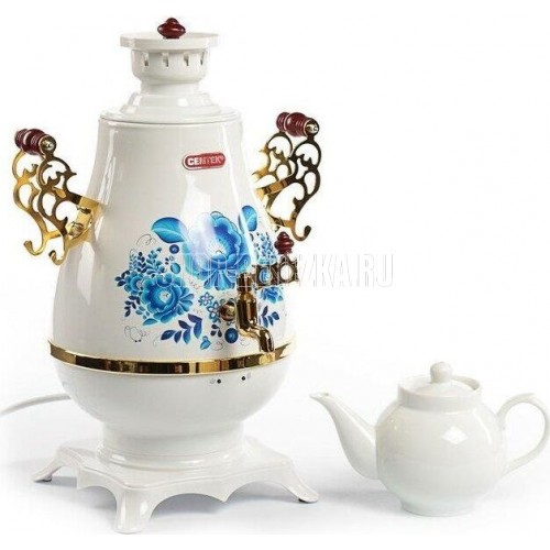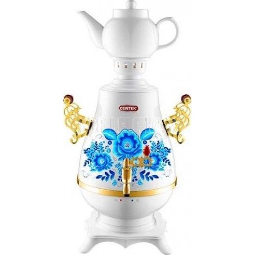 Самовар Centek СТ-0092 A (белый+рисунок+золото), Максимальный объем4 л Максимальная мощность2300 Вт Функция поддержания температуры Скрытый нагревательный элемент Керамический заварочный чайник1 л Съемный фильтр для заварки LED-индикаторы работы и нагрева Хромированная отделка корпуса Защита от включения без воды Автоматическое выключение Защита от перегрева