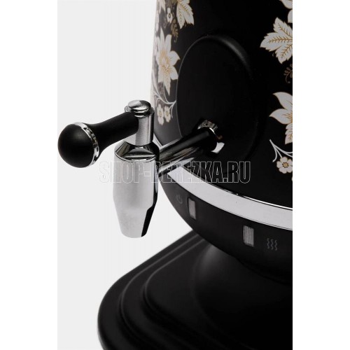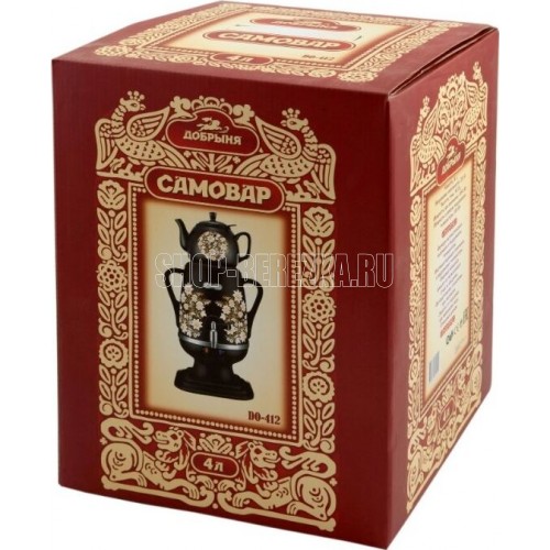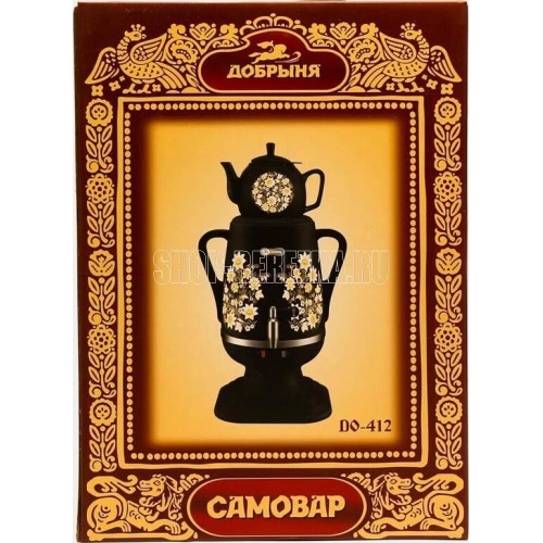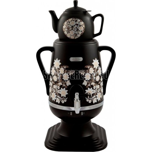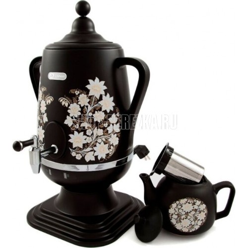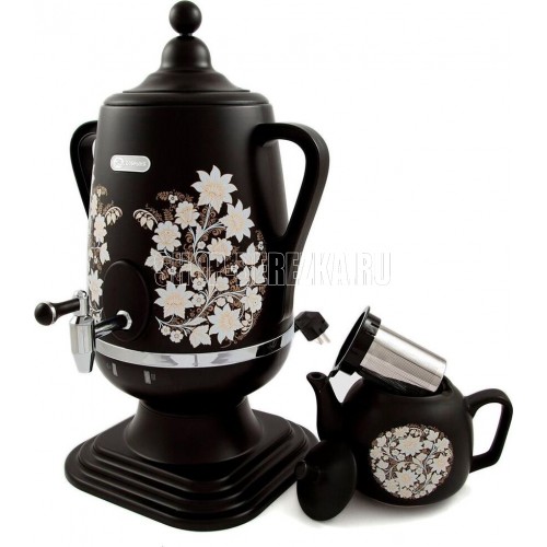 Объём: 4 л. Материал: пластик. Цвет: чёрный с росписью. Керамический заварочный чайник 1 л со съёмным фильтром из нержавеющей стали в комплекте/высота 145мм. Хромированный кран. Функция термопота. Мощность при закипании 1850 Вт. Мощность в режиме подогрева 100 Вт. Напряжение сети 220 В Дисковый нагреватель, световая индикация работы, автоматическое отключение, защита от перегрева при выкипании воды