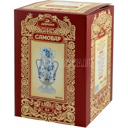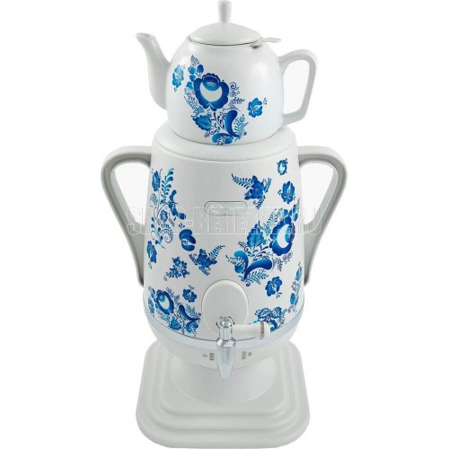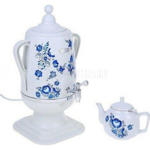 Объём: 4 л. Материал: пластик. Цвет: белый с росписью. Керамический заварочный чайник 1 л со съёмным фильтром из нержавеющей стали в комплекте/высота 145мм Хромированный кран. Функция термопота. Мощность при закипании 1850 Вт Мощность в режиме подогрева 100 Вт. Напряжение сети 220 В. Дисковый нагреватель, световая индикация работы, автоматическое отключение, защита от перегрева при выкипании воды.