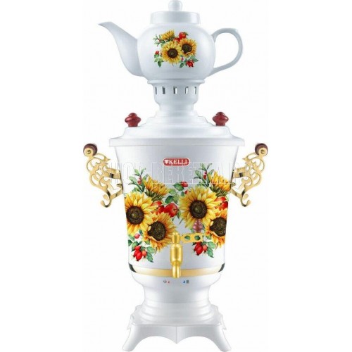 Электрический самовар с заварочным чайником; Объем: 4 л; Заварной чайник: 0,9 л; Раздельная нагревательная система; Кнопки вкл./выкл. и поддержания температуры; Функция автоматического кипячения и поддержания температуры; Закрытый нагревательный элемент; Пластиковый корпус; Заглушка на самовар; Удобные ручки для транспортировки; Удобный хромированный кран/ Световые индикаторы; Защита от перегрева при выкипании воды